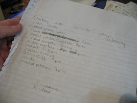 Next, I plan when to cook each item. This schedule, written sixteen years ago when I hosted my first Thanksgiving, was in the blue recipe folder. It gives me a hint of when each item needs to be cooked.